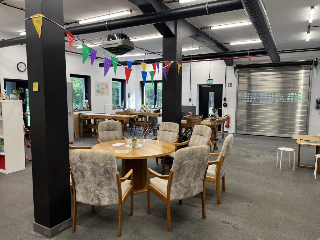 In einem großzügig ausgestatteten Nebengebäude am äußeren Rand des Geländes stehen den Teilnehmern neben dem Werkstattbereich eine Wohnküche, ein Badezimmer, ein flexibler Schulungs- und Begegnungsraum, ein Musik- und Freizeitraum sowie verschiedene Rückzugsbereiche zur Verfügung. Durch einen direkten Zugang zum Außengelände und einem angrenzenden Waldgebiet sind vielfältige Aktivitäten in der Natur möglich.